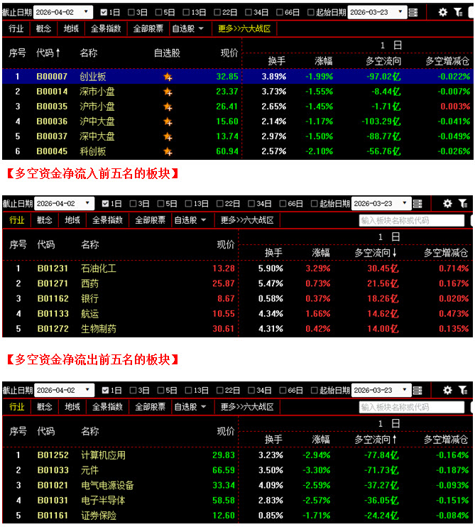 从板块资金动向数据来看,截止到今日收盘时,在资金流入榜上,石油化工板块以30.45亿的资金流入额位居榜首;其次是西药板块,资金流入21.56亿;此外,银行板块、航运板块、生物制药板块的资金流入额也都相对较多,分列资金流入榜第三到第五名位置;再看资金流出榜,计算机应用板块引领做空,资金流出77.84亿;其次是元件板块,资金流出77.73亿;此外,电气电源设备板块、电子半导体板块、证券保险板块也都相继上榜,三个板块的资金流出额分别为37.27亿、36.05亿、24.24亿。综合比较后可知,今日不仅计算机应用板块与元件板块资金流出双双超过75亿,电气电源设备板块与电子半导体板块的资金流出额也都在35亿之上,昨日刚刚反弹了一天,这些板块就再度集体大幅杀跌,导致场内多方人气受到明显打击;反观多方阵营,虽然石油化工板块资金流入超过30亿,同时银行板块也出现在资金流入榜前列,起到了一定的护盘作用,但与空方力量相比,做多力度明显偏弱,难以形成有力上攻。从六大战区的情况分别来看,截止到今日收盘时,六个战区均为资金流出状态,其中不仅创业板战区与深中大盘战区资金流出双双超过88亿,沪中大盘战区的资金流出额更是高达103亿。可见今日空方再度全面施压,各战区均有资金出逃,说明在昨日快速反弹后,不仅多方后续力量没有及时跟上,反而有很多投资者选择了逢高减仓,退出观望。在这种情况下,反弹的持续性自然就无法保证,预计接下来行情仍会在3900点一带出现多次反复。建议大家控制好仓位,保持谨慎,同时可关注近期有资金连续加仓的板块,并在其中优选个股,逢低吸纳。