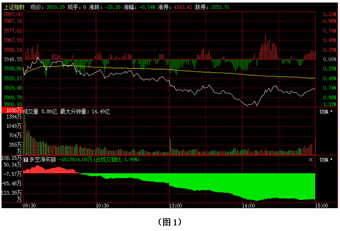 如图1所示,今日早间大盘小幅低开后,也曾试图上攻,但指数很快就在3950点附近遇阻,无法向上形成突破,市场只得逐步回落整理,午后大盘继续向下回探,盘中一度跌至3900点整数关口附近,好在整数位的支撑依然存在,尾盘时指数略有回升,最终以3919点收盘。从下方的多空资金来看,早间开盘后,多方率先占据优势,但资金进场的持续性不强,随着大盘遇阻回落,场内抛压逐步增大,资金由红翻绿,并不断流出。可见今日多方无力延续昨日反弹,空方趁机再度施压,虽然3900点整数关口起到了一定支撑作用,但如果接下来多方无法及时发力,任由空方连续打压,行情很可能会再次跌破3900点,并进一步向下回落。建议大家仍需控制好仓位,保持谨慎。