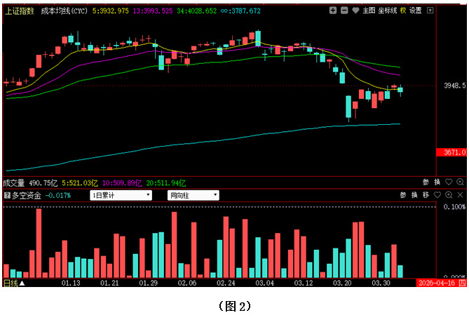 再看图2,今日大盘未能继续向上快速拉升,指数低开回落,再次跌破5日成本均线,预示着市场在3900点一带或仍有出现反复的可能。从下方的多空资金来看,今日多空资金为流出状态,虽然资金流出量小于昨日的资金流入量,但从多方无法连续发力上可以看出,当前投资者的追涨愿意普遍较低,所以在昨日快速反弹之后,多方后续乏力,指数自然无法站稳在5日成本均线上方。这就意味着自3月24日开始的反弹很可能是市场下跌过程中的一次弱反弹,之后大盘或有二次探底的动作。建议大家控制好仓位,不要急于重仓抄底,可关注近期股价跌出黄金坑信号后有资金连续回流的优质个股,逢低逐步吸纳。