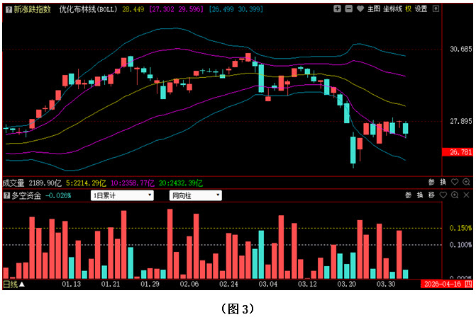 今日两市上涨个股共894只,其中涨幅超过3%的个股204只,涨幅在9.9%以上的个股36只;下跌个股共4237只,其中跌幅超过3%的个股1200只,跌幅在9.9%以上的个股12只。图3所示为指南针特有的0Z指数K线图,从图中可以看到,今日0Z指数低开回落,再次收出阴线,收盘位置与周二收盘时基本持平。可见今日场内多数个股不仅没有延续昨日的反弹,反而再次向下回落,将昨日的反弹成果快速吞噬,所以目前市场整体走势依然偏弱,。从下方的多空资金来看,今天多空资金为流出状态,虽然资金流出量很小,但已成功打断了多方的上攻节奏,使得0Z指数只能继续维持着横向震荡状态。需要注意的是,随着优化布林中轨的持续下移,多方面临的压力会越来越大,届时一旦0Z指数无法向上突破优化布林中轨,空方趁机施压,行情就很可能会出现新一轮下探。
